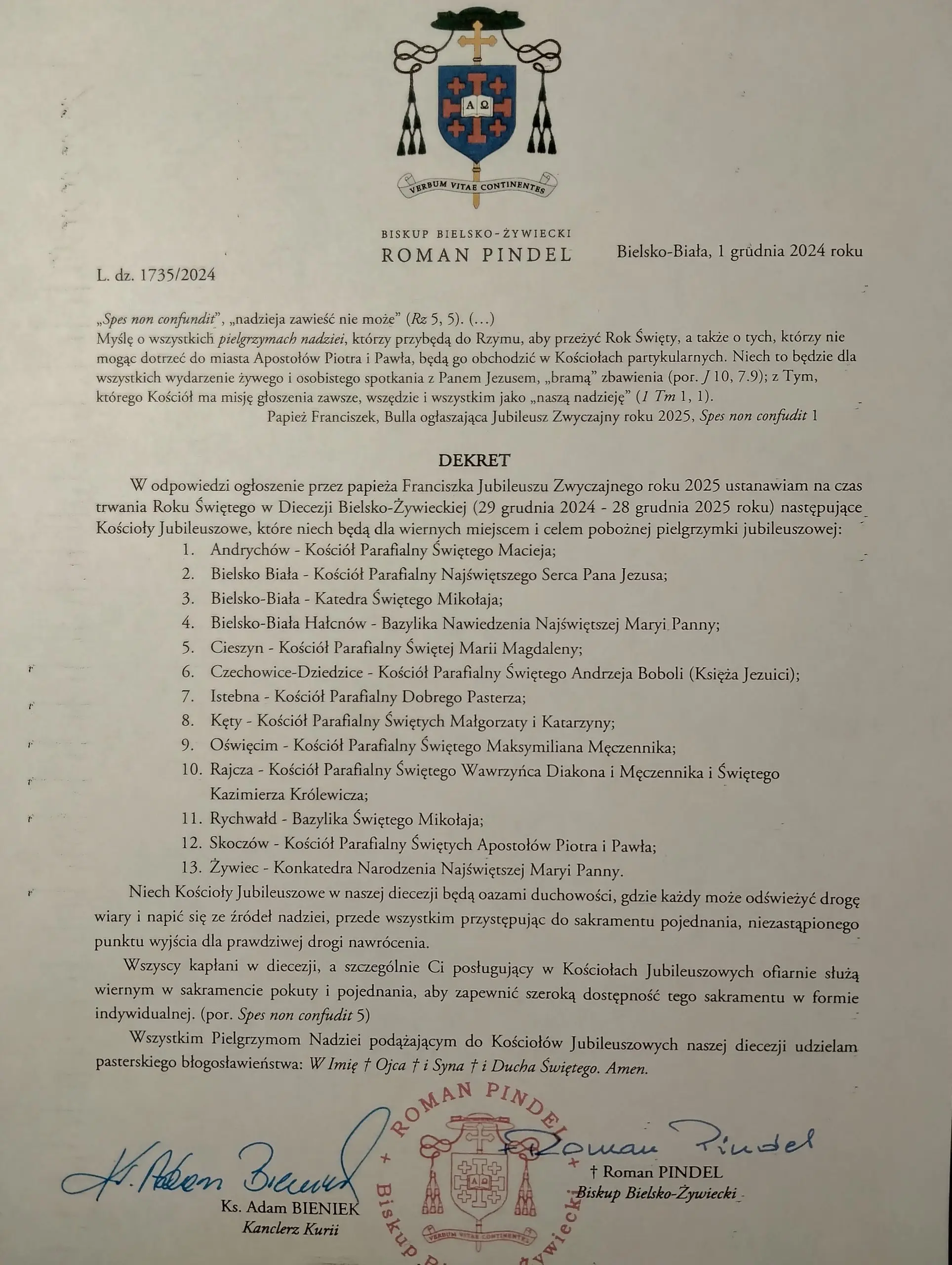 Dekret Biskupa Diecezjalnego Romana Pindla o ustanowieniu w naszej diecezji bielsko-żywieckiej Kościołów Jubileuszowych z racji ogłoszonego przez Ojca Świętego Franciszka roku 2025 jako Jubileuszu Zwyczajnego. Wśród wymienionych świątyń jest także nasza Bazylika p.w. św. Mikołaja biskupa